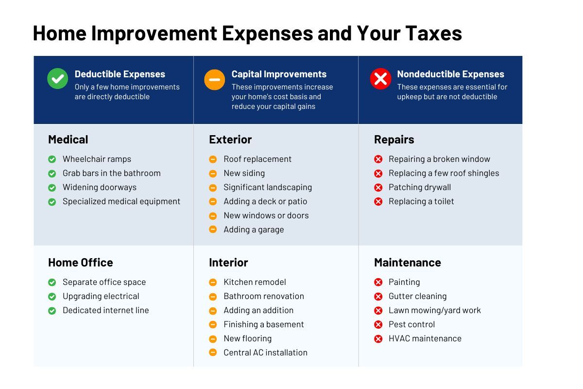 Beyond capital improvement, there are a few specific categories of home improvement that are deductible, including work on home offices (which is subject to specific limitations) and certain modifications for medical/accessibility reasons.11